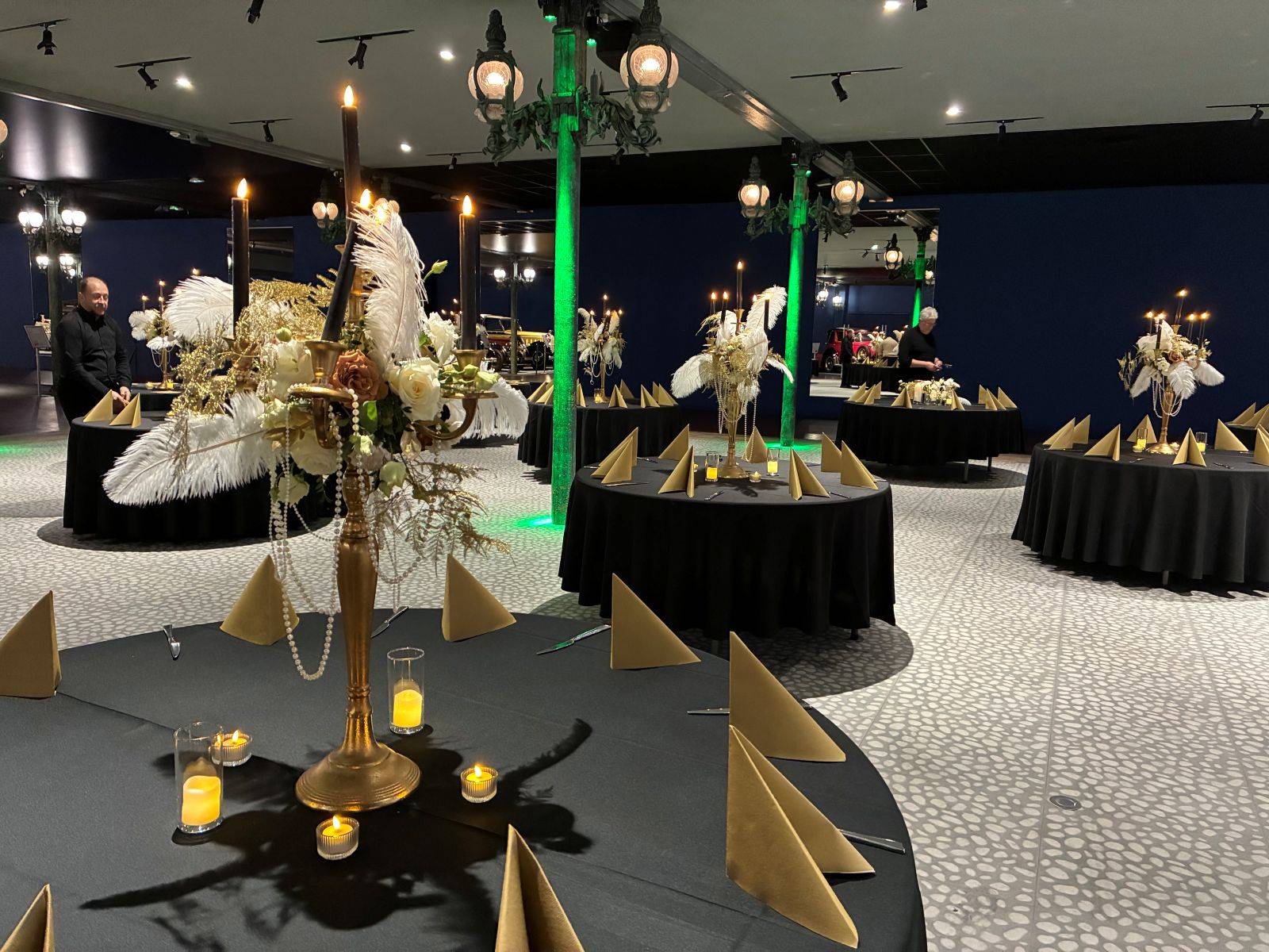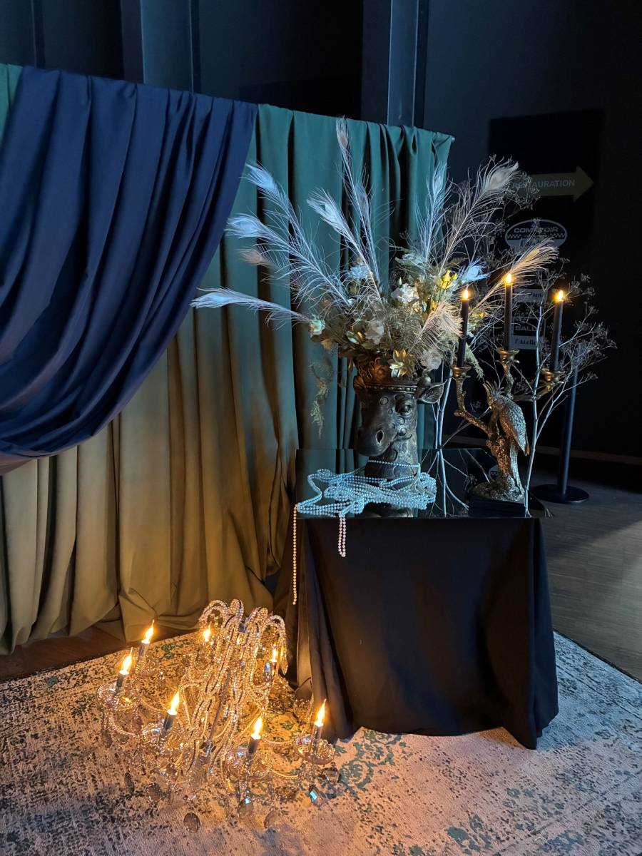 Les installations végétales temporaires respectent l'intégrité des lieux tout en créant des points focaux visuels. Les compositions florales sur socles noirs apportent une élégance discrète qui ne concurrence pas les collections exposées. L'éclairage par bougies LED renforce l'atmosphère sans risque pour les œuvres.